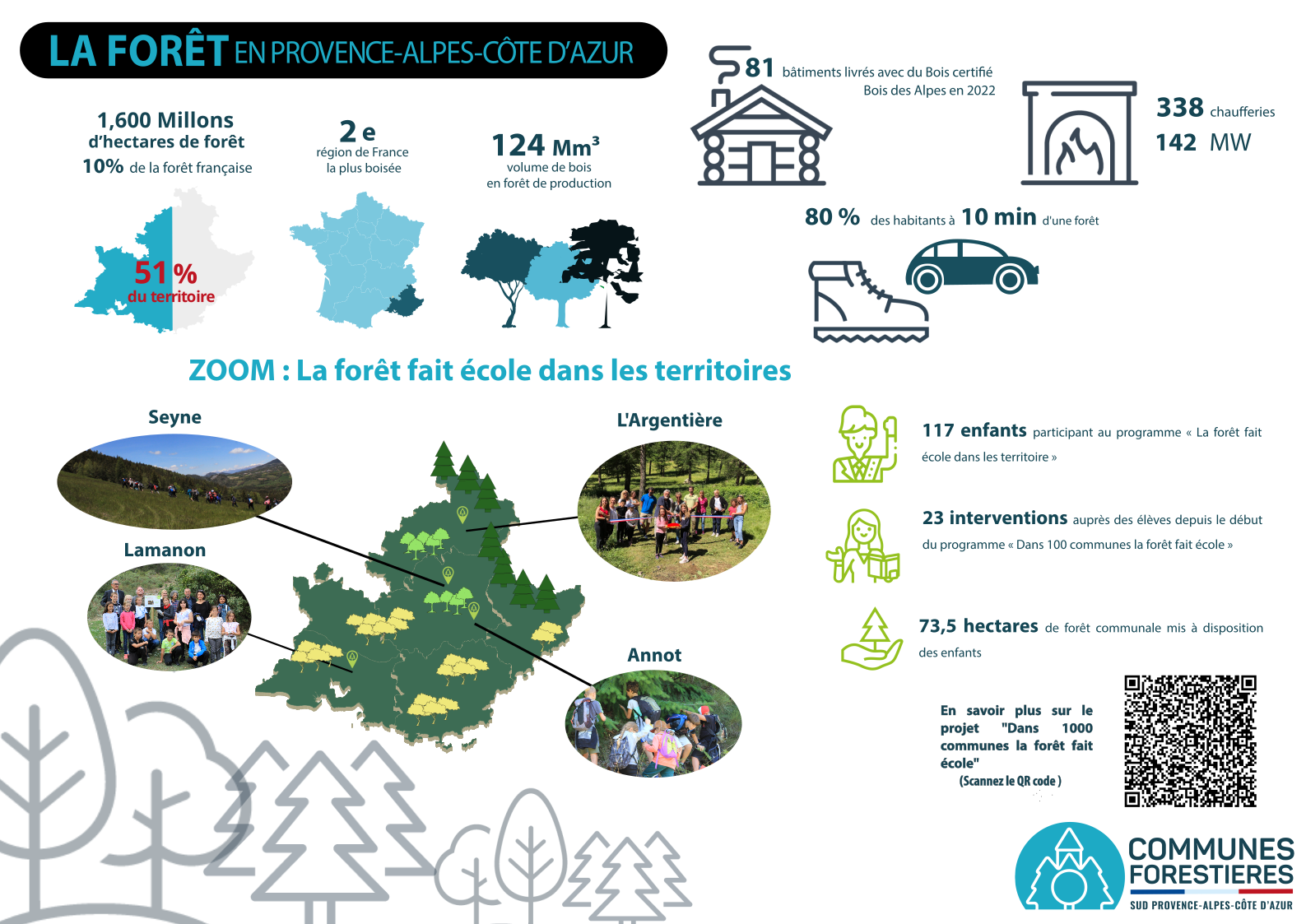 Afin de marquer l’évènement et pour valoriser les données de l’Observatoire de la forêt méditerranéenne que nous co-animons aux côtés de la DRAAF, de la Région et de Fibois, nous avons élaboré une infographie reprenant nos données forestières et mettant l’accent sur les forêts pédagogiques en région.
